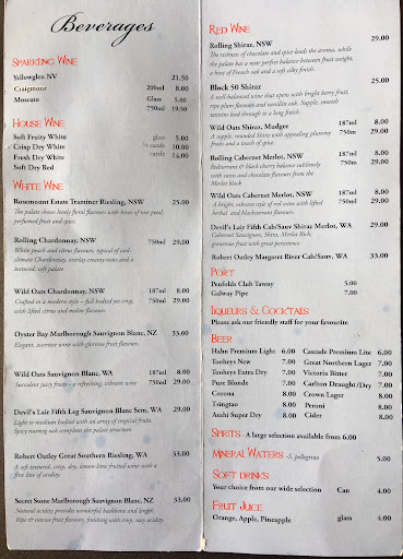 The pricing was reasonable but at the end of the night they wanted to add a 10% public holiday surcharge for Easter Saturday. When my wife said that it wasn't a public holiday, she was told to "Google it". We did and it still wasn't a public holiday. I doubt that they were paying their staff any extra.