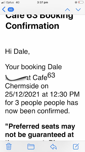 I did as was instructed and contacted the store via email and explained my concern and disappointment At time of writing I have still not received correspondence via email from anyone from your organisation , Again on the 26th Dec I tried again via text and received a generic text Thanks for your enquiry for Cafe63 Chermside How may we help " to my phone . I again explained the situation and again have heard NOTHING from anybody. It is now the 27th Dec and nobody from your organisation has bothered to reply to my phone call, email or text.
