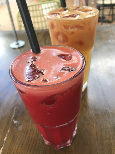 Why have we never been here before? The cafe sits in an old corner store, with outside seating, and a lovely treed atmosphere so you don't even notice the passing cars. Hubby and I headed here for brunch a few days ago, and were very happy. He drank a sweetie punch with watermelon, apple and orange - cool and refreshing; I had the cleanser with beetroot, ginger etc - also cool and fruity and refreshing. We both chose bruschetta - on Turkish with smoked salmon, poached eggs, pumpkin dip and lemon. I also had hash browns (happily came as 2) while hubby had halloumi as an extra. We both adored this dish! Lovely thin, crispy bread, nicely runny eggs, spicy pumpkin dip, plenty of avo, chopped tomato and onion, and a bit of greenery on the plate. We both really want to come back to try other dishes! Staff were friendly, service prompt, and we loved our brunch! Clearly, well-loved by the locals who regularly come here. And now we will do the same. Happy New Year...