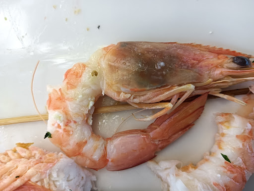 Based on my past experience working in the hospitality industry, it would appear that the prawn had been left at room temperature or less than ideal temperature for too long.