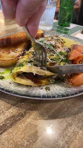parmesan omelette🍳: wow this was so packed with flavour, unlike other omelettes, the fillings aren’t combined within the egg, whereas they are layered and stacked inside the fold i personally like that better as the normal ones have too much egg in ratio to fillings inside was onion jam, bacon and mushroom, wow. these all worked so well together, crazy honestly😫🤤