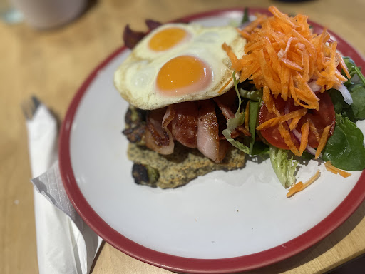 I love this little cafe! I have been for brunch three times now and go there some mornings for coffee. The service is great, staff are friendly and happy to go into detail to explain menu items. The food is superb and if you are vegetarian like myself, there are many delicious meat free options :) I usually order the halloumi vegetable stack which is a decent size and very tasty. I accompany it with an almond white hot chocolate which is so smooth and tasty that every sip is heavenly. My boyfriend orders the colossal burger which is MASSIVE. He usually can eat a lot but he cannot finish this burger. It comes with fries or sweet potato friends. The sweet potato fries are big and chunky but are a little less crunchy than your usual fries. They are still very yummy nonetheless. I would recommend this...