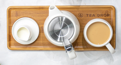 The waitstaff was carrying a tray with three items, a side plate, a full pot of boiling hot tea, and a teacup using one hand from the left end of this long and narrow tray. (image attached of the tray and product).