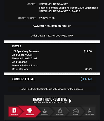 The worst thing till now I eaten on the name of Pizza. On the name of pizza soup I believe more than 3 scoups of tomato sauce as first thick layer. Which made the crust of the base as soogi as dipped in water. As you can see the order deatils crust was upgraded as at least the end of each slice was ok to eat that's by I added 2 starts otherwise the minimum 1 star. I added extra oregano which I couldn't find and apart from that the basic toppings are not even upto the standard. The Spicy Veg Supremeis a joke, is the name but after today I suggest to change to Tangy Tomato Supreme. I was noticing the standard was dropping, but not this exponentially as I'm a regular takeaway for every Friday. This new disgusting flavour is hard to shake off. I'm pretty sure after this horrible experience that my taste buds had I ever visit the same Domino's again. Hopefully other people don't have to get the same worse tast after reading it and someone from the higher ups take it seriously as it's customer's hard earned money specially these days. So try to approach the business standards and...