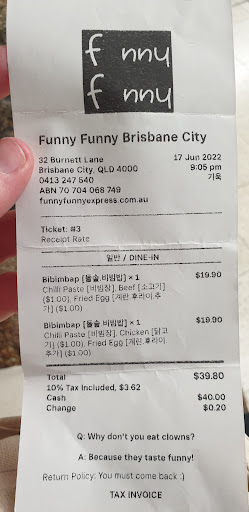 Read moreWell, if you read many of the previous reviews it would put you off visiting the Funny Funny Korean Restaurant. However my partner being Chinese and it was dragon boat festival time she asked me about going to Funny Funny for some genuine Samgye-tang or ginseng chicken soup. I read many of the reviews and noticed it was more about poor service and really not much said about the food. So many whimpy whingers who write those poor reviews. Here is what we found. Down the lane off Adelaide street in Brisbane a quaint little area of small resturaunts. We entered FunnyFunny and met with a lovely smile and immediately taken to our table. Scanned the bar code with my phone camera and were able to order in minutes, ( much easier than Coffe Club app. ) the moment we paid the waitress brought plates, drinking water and a stove to our table. After about 15 minutes we had rice, vegetables, Kimchi (napa cabbage and a large bowl of what looked like half a chicken in soup. My China girl is very fussy when it comes to food, she said it was delicous and very generous amount for under $25.00. Well she was so pleased with me and we had a wonderful night which to me is everything. We will return to he Funny Funny Korean Restaurant again in the future for sure. I liked. The food, being able to order without any pressure, could just scan and order more food as needed, after eating we just stand up and walk out with several thanks to staff, the layout was good with some separate areas to eat, the decoration suited the style of the resturant, in Brisbane which in my opinion is one of Australia's most liveable places. As we walked onto the street there was some light rain which was beautiful with the laneway lit up with small resturants signs and with many people huddled up enjoying life as it was meant to be. Just a lovely night for the both of...