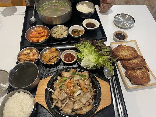 Read moreHad dinner here first time with hubby & son. Ordered spicy pork set, pork belly set, a seafood pancake and 5 pieces dumplings. Restaurant is clean & well kept which is welcoming. Quite noisy where a group of Korean men talking and laughing very loudly but luckily they left after we sat down 20 minutes later. Menu are quite limited but that's fine with us. Overall food we ordered are quite nice, spicy pork not spicy enough though but meat are juicy and succulent. Dumplings are delicious , crispy on the outside and juicy and fragrant on the inside. The seafood pancake however is quite a letdown because the center of the pancake is gluey wet due to batter not properly cooked.