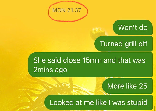 Please learn how to read time, do not lie to customers because you want to clean up early and look at them like they’re the stupid ones for wanting to order food, just under half an hour before closing time. Here, 9:35pm isn’t 15 minutes to 10pm, just very very bad.
