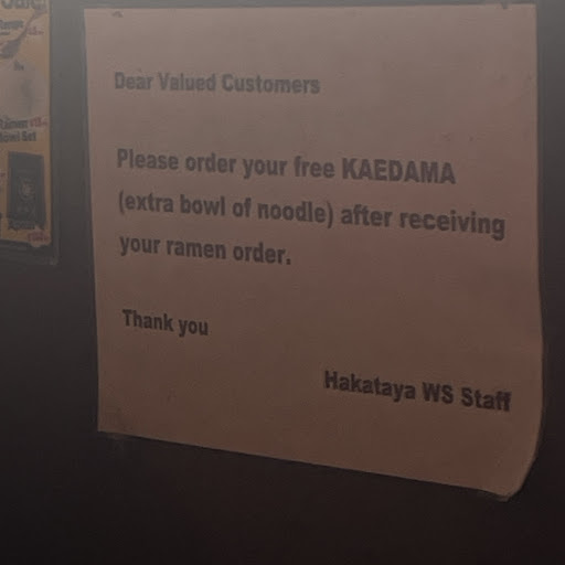 Monday, 12th Sep 2022. Always been a Hakataya Ramen fan. Arrived at peak dinner time 6pm. Lots of people and nearly all tables taken, but there is only 1 lady working in the whole of the shop!? Cooking, taking orders, packing, cleaning the tables etc etc. Despite how busy/stressful the environment was, she was extremely friendly and lovely, tried her very best to do her job without letting the customers wait for too long however I can see how overwhelming it was. Owner of Hakataya Ramen, please if you see this employ another staff member! 1 lady running the whole restaurant during peak dinner service is borderline overworking your staff. Putting 3 stars to gain your attention otherwise 5 stars. Love your ramen but please for the sake of your staff employ at least 1...
