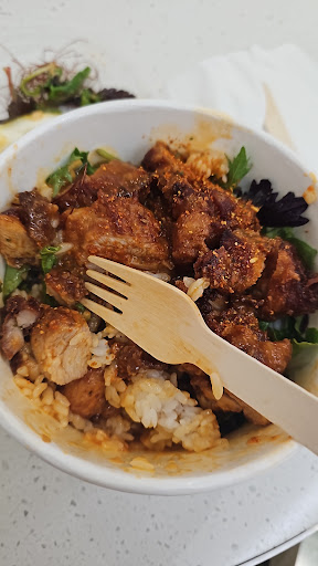 Read moreStopped in to grab a bite to eat. The gent behind the counter was super fast in taking the order, however my complete order (and someone else's - 2 dishes) were sitting on the pick up counter behind him for a good 3+ minutes before he passed them over as he was counting the money in the register... what can I say, I was hungry!? I ordered a large Kay's chicken, regular teriyaki chicken and a regular beef yakiniku, each on rice, plus a bottle of tea. Kay's and the yakiniku was on point for the serving size and balance of topping to rice, although the yakiniku was a bit dry. The teriyaki chicken had four (4) slices of chicken (I wish I was kidding) and a smattering of salad. Super lack-lustre and had I only ordered that, I would...