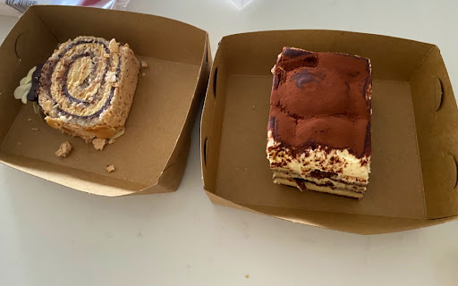 The barista comes back with two boxes with two newly cut cake. We open the boxes - tiramisu looks smaller and the chocolate bakka looks slightly bigger than before.