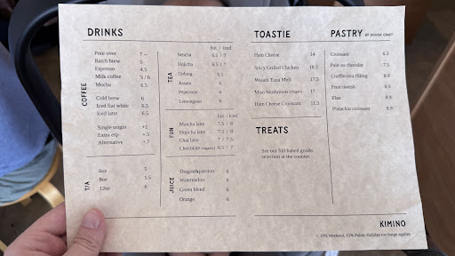 Read moreLoved our 1st visit to Kimino. Started with a Macha which was made perfectly using high quality macha powder. The baked goods were fresh and delicate too. Tried the miso mushroom toastie, crispy and the mushrooms were delish. Finished up with two different pots of single origin pour over coffee. Flatmate reckoned it's the best coffee he's ever tasted and I'd be inclined to agree. Can truly taste the quality and freshness, almost impossible to find black coffee that tastes as light and rich. Loved the minimalist style of the interior and there was plenty of seats. Owners were very welcoming and took the time to answer questions about the menu and provide reccomendations! Will be back...