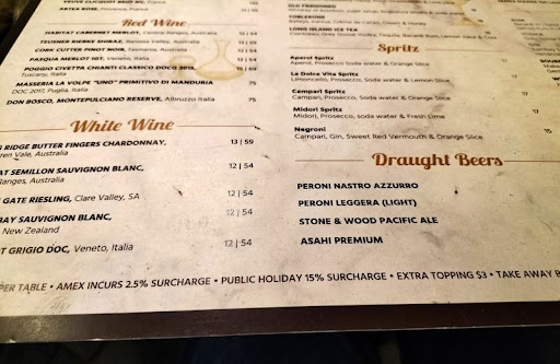 The steak was a tad overcooked but had a really lovely flavour and char. The prawns were cooked well and also had a really nice flavour but everything was a bit disjointed on the plate. Unfortunately the whole dish was let down by the sauces. I was initially going to order the red wine jus but the server advised me it may clash with the garlic sauce the prawns are cooked in. Consequentially, I opted for the mushroom sauce instead which was OK (not a very strong flavour) but cold. My friend ordered the same meal but with the peppercorn sauce which was, for lack of a better word, disgusting. The flavour was strangely perfume-y and not like any other peppercorn sauces we have tasted. The texture was thick and floury (more a paste); it was almost like someone had added too much cornflour or perhaps not diluted a packet sauce enough. I'm glad it was served separately or else it would have rendered the meal inedible. The dressing on the side salad was nice, but to receive a meal to have three different sauces on a plate is a bit strange. Nothing tied all the elements together to make it taste well as a complete dish and, as you can imagine, the plate ended up a bit soup-y by the end. We didn't stick around for dessert but the wine was lovely and a well recommended pairing.