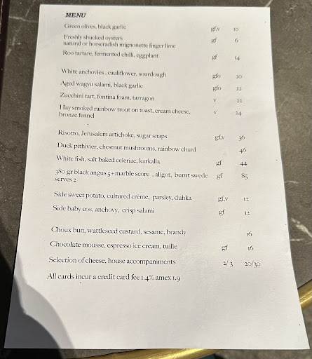 The food menu was concise and well curated. Starters were excellent, in my view better than the main courses. We had the $49 wagyu main: slices of beef, with a lovely sauce and scattered sorrel leaves. It doesn’t come with anything else, so you need to order sides (they had two to choose from: roasted sweet potato and an heirloom tomato salad). The wagyu main was not well cooked and left the taste of disappointment in my mouth and my two dinner guests, who had ordered it as well.