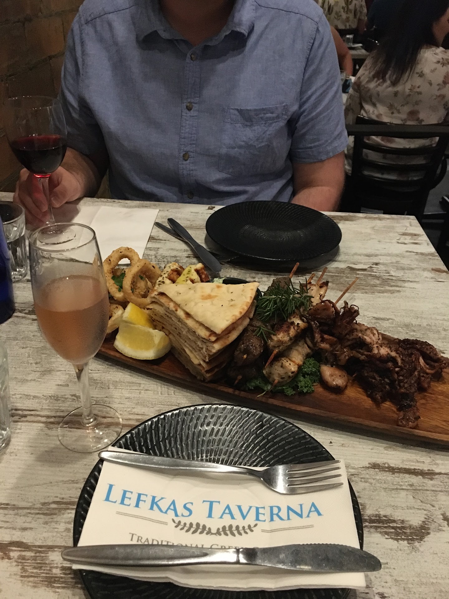 Read moreMy birthday is coming up and we decided to go out last night to have a date night. We chose Lefkas and made a booking two weeks prior after having a look at their menus and reviews and it was absolutely a great decision. We had a wonderful night dining at Lefkas, from their service to their food and drinks. As shown in the pics, we ordered a combination platter, which had a bit of everything, chicken, lamb, seafood, pitas and a big chunk of halloumi. The lamb was grilled medium rare and was quite flavorful and juicy. I really loved how they seasoned the meat. The chicken was tender and tasted different than the lamb but still quite delicious. We especially loved their baby octopuses and deep fried calamari. They were so well done and we couldn’t figure out how they cooked the octopuses but they were yummy. And the halloumi, best grilled halloumi I have ever had. We reckon it was pre-marinated. So tender and easy to cut through and the cheesy flavor was well maintained despite of the saltiness that comes with it. The tzatziki dip was so creamy and rich and we loved every bit of it. We were a bit surprised at the portion of the platter when it was brought out as it didn’t look as much in pictures we had seen previously. It was def enough for two people. As for the drinks I got a Moscato and for someone who only drinks a few times a year, I must say I really enjoyed it. It had this distinctive fruity flavor to it and was easy on the throat when swallowing it. My boyfriend grabbed their Vilana Vidiano, which is Greek and I must say even I liked it and I don’t even like red wine that much. The service was quite good. The staff were friendly and attentive. The whole place was radiating a young and vibrant vibe and was so full of energy. It does get busy and you may have to wait for a bit if you show up without a booking. All in all, it was a quite a pleasant and high standard experience and we will def...