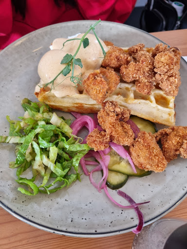 we ordered the dogs breakfast, nacho imposter, hello me roll, mr benedict wafflebatch - just typing these out I realise the puns HAHA. overall the dishes were really nice and quite unique, the roll was a lot larger than I expected - this was probably my favourite thing we ordered. the nachos were really interesting because they had deep fried the corn fritters, the egg on the dogs breakfast was probably one of the most beautiful eggs I've seen and the only complaint was that the waffles were a little dry.