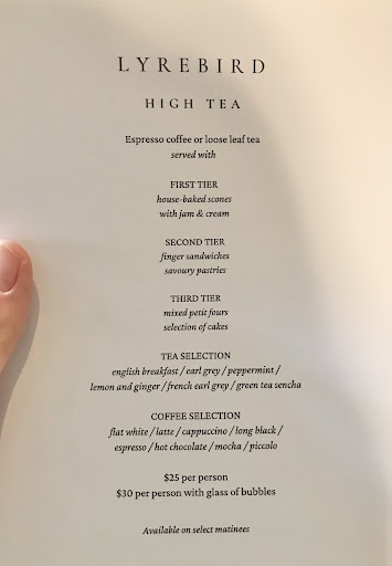 First time dining in the Lyrebird and had the high tea which is offered on Wednesdays and Saturdays prior to the matinee shows. We weren’t attending a show on this day (Saturday service) but were still able to enjoy the high tea. Pre-booking for Saturday matinee service is essential (as for most high teas), and you won’t get in without a booking at this time as they have caps. High tea was $25 a head or $30 including a glass of sparkling wine which is a phenomenal price.