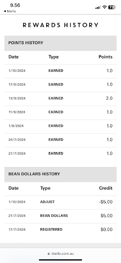 On October 1st (today), I intent to buy a large hot choc ($5.40) at Merlo UQ St Lucia. I intent to redeem my bean dollars ($5) as stated in my account, but after scanning my membership, the staff said the machine cannot read the bean dollar, so I still have to pay in full price. Therefore, I decided to buy a small one ($4.90). A few minutes ago, I checked my account and my bean dollars has been redeemed on October 1st. Can you guys explain this? Is it possible to get my bean dollars refunded to my account so I can use it next time? Thank you. [Photo attached...