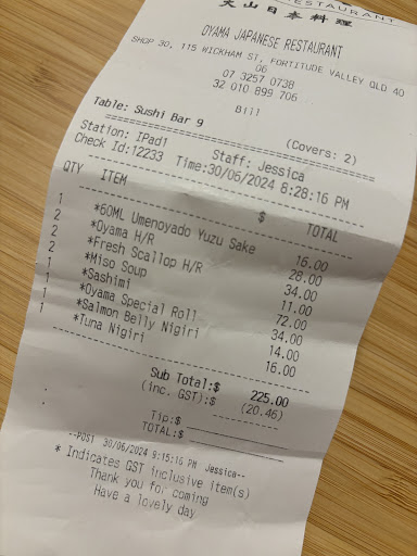 Read moreMy friend, son and I dined at this restaurant on Saturday night and were very disappointed by the service, wait time and exorbitant cost for average food. My friend speaks fluent Japanese but the Japanese chef refused to speak in Japanese to her. My son is learning Japanese so we thought it would be fun to order in the language. That was clearly a mistake. We then had to wait for approximately 15 minutes to be seated in a booth despite the restaurant only being a third full. The waitresses were unfriendly and did not coordinate so they both kept trying to take our drink orders. We ordered the sashimi platter, which was $72, and the grilled salmon teriyaki roll, which was $32, for my 10 year old. He was forced to wait 40 minutes for his roll due to one waitress forgetting the order and then a lengthy kitchen delay. The sashimi was ok but I found a dish scale in my kingfish, which was unpleasant. Dessert was good. The cocktails were nice but expensive. (Between $22 and $24) We were most disappointed by the service. We felt uncomfortable throughout the meal with the sushi chef trying to talk to us from behind the bar rather than coming to our table to address the order mixup. His daughter, one of the waitresses, was clearly annoyed with us for asking about the status of our order and was unfriendly and rude. For a meal that came to $253 we expected everything to be top notch. This is one of the worst dining experiences I've had when travelling. We left as soon as we'd...