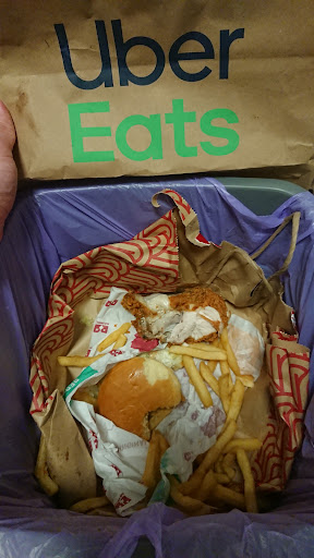 Chicken pieces were stone cold, overcooked to dry as woodchips meat, and the crumb tasted like stale cardboard. Couldn't even choke one down. Inedible. In the bin.