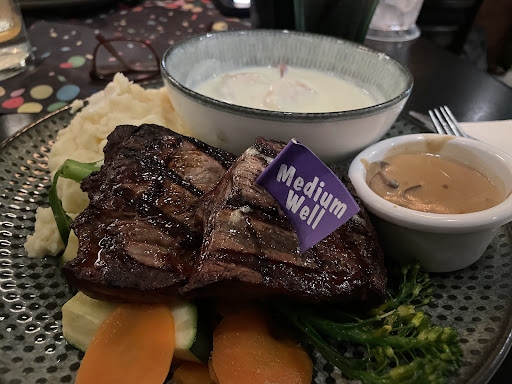 I ordered a medium rare steak (which was cooked perfectly) and my partner ordered the pan-seared salmon. Both dishes were delicious! The mushroom sauce was divine.