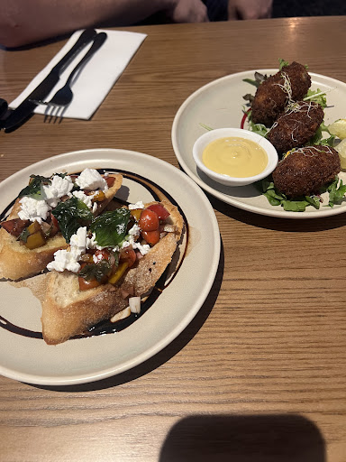 Our food came and for the price we paid the portions and food quality was not good. 2 pieces of tiny slices of bruschetta for $21?!?! The cost price on that dish must be about $2 max. Ridiculous. And it was just ok. The croquettes were clearly overcooked or the oil was dirty as they came dark brown and was literally just deep fried pulled apart meat. Not much flavour or anything more to it for $20. We asked for mayonnaise to go with my sonâs chips, we decided against a kids meal at $17. We were told they donât have mayonnaise. Then overheard another table being offered aioli and had to ask for that.