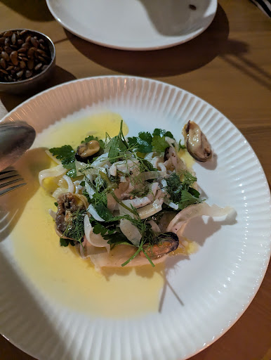 First things first, the fit out is amazing. We arrived just before our 3pm reservation (the only time slot available) and were told the table wasnât ready yet. So fair. When we were shown to our table there was no effort to place our napkins down and the host kept looking around and not at us. We then had another waiter come over, not introduce himself, not ask how our day was going, just hover awkwardly. It wasnât clear whether he was allocated to our table or was even employed there. He did note how many dishes he recommended for sharing and offer to speak to the somm when I queried about some wines but the response I got back (from the Somm) to what Iâll admit was a bit of loaded question, as to whether one of the particular (cheaper) sparklings was good was to the effect of âit wouldnât be on my list if it wasnâtâ. Well okay then.