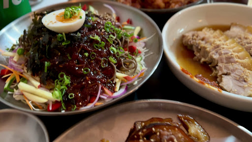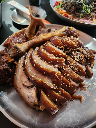 We ordered set menu (choose 2 ) that jokbal and spicy jokbal. Normal jokbal was great, well-cooked, well-balanced between meet and fat so we enjoyed. However, spicy jokbal is not spicy than we expected. I normally can't handle spicy and not hit to me. And there was only meat (no fat and no bone) and it was dried and a bit chewy. Makgoksu was more hot than spicy jokbal. Makgoksu sause was great as not watery (thick), plenty of vegetables with. Anyway we hope there was more noodles because it was yummy. Side dishes were great especially fresh-made kimchi.