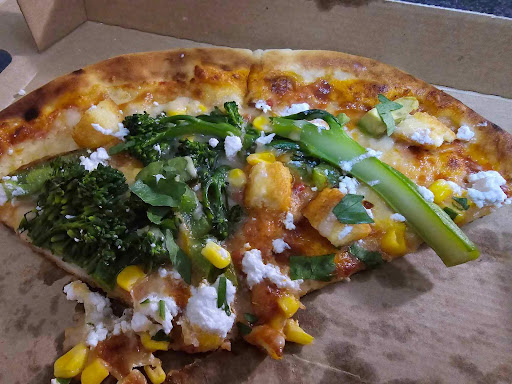 The vegetarian pizza: Was cut in extremely uneven pieces, with one piece being gigantic and others being small. Very abnormal topping choices. Such as huge pieces of broccoli (you can see one of the many of the huge pieces of broccoli in the photo), it was lathered in corn (even though that was not a listed topping).