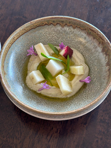 We started with a selection of Ceres Hill marinated olives and house-baked sourdough with cultured butter—simple, flavourful, and beautifully made. The new season garden amuse - turnip with tahini was a delightful little surprise, paired perfectly with a bright 2022 Breaking Ground Rosato that set the tone for the afternoon.