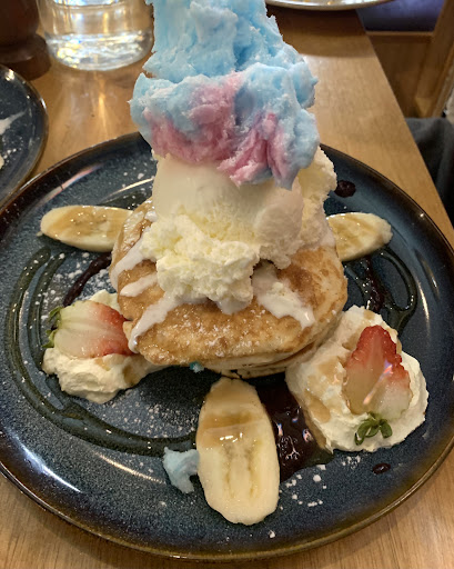 Pancake stack - big serving size, has it all! Fairy floss, icecream, delicious fruit.