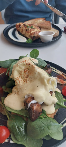 Wonderful little cafe with indoor and outdoor patio seating. Location is ok although my visit wasn't for the veiw of the Southwest hwy. Went at about 11am for brunch. Easy to get a table at this time. I ordered the "mushroom Hash stack" and husband an omelet with bacon, cheese, tomatoe and mushroom. Coffee was lovely and made at a fantastic temperature and taste was smooth. Food was delicious and fresh. Husband loved his omelet and looked to be a wonderful portion. Mushroom Hash stack was big! Big beautifully cooked Mushrooms with Spinach, Cherry tomatoes, Hash browns (about 3), poached eggs and holinaise sauce dusted with paprika. I enjoyed my meal and couldn't finish (the best to my ability tried) only thing I wish they had done was slightly wilted the Spinach, lightly fried the tomatoes and hoped for my eggs fo be a little runny not hard, but the flavours were beautiful and would highly recommend stopping past. The menu is very accommodating and...