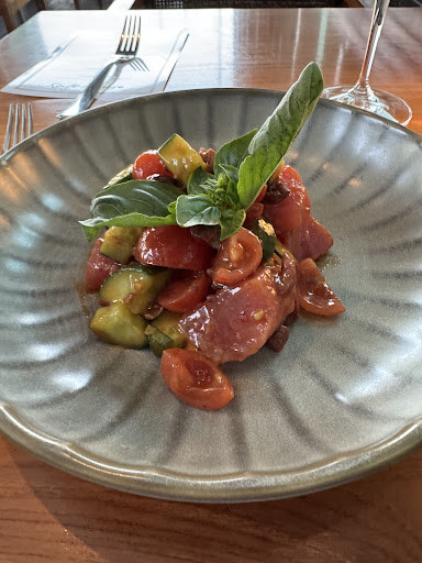 Yellow Fin Tuna Sashimi - Yellowfin sashimi grade tuna Heirloom tomato, dashi ice, chilli kanzuri (fermented chilli), shaved onion Glass Cloudy Bay Chardonnay Hurrah Excellent Quality of Tuna. Big chunks to delicious Look at the big chunks of delectable juicy Tuna wow. Dam bit of sinew stuck in my teeth about 3cm long. Come on good restaurants would check for that. So basically it’s raw fish with a salad of: Cherry tomatoes, cucumber and olives. It actually works very well together. There’s a hint of spicy heat from the fermented chilli it does last on the palate. The basil for me was too much for the fish. The aroma of it is very nice. Dish is missing the shaved onion Very good dish with excellent Tuna.