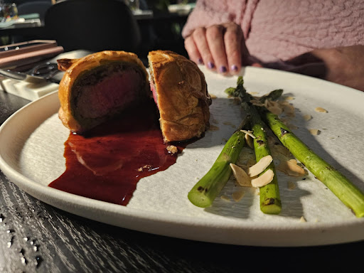 This was absolutely incredible from beginning to end 👏 We started with the Prawn macaron with sea urchin. Now I personally don't like prawns or macarons but Bella wanted to try, so i thought I would at least have a taste, and I am surely glad I did. It was an amazing opening gambit to let us know we were in for a very exciting meal. It was the perfect balance between sweet and savoury. The savouriness and creaminess of the prawns was perfectly balanced by the sweetness of the macaron. With the salsa underneath cutting through all that richness in the most perfect way. We followed with snapper in vine leaves with preserved lemons, roasted cherry tomatoes and sea foam. Cooked to perfection and all coming together harmoniously in one perfect bite. We also got the grilled cauliflower as a side dish with fish roe spread. The cauliflower was cooked perfectly, but the whole dish could have done with more seasoning to be honest. The Beef Wellington was well crafted and the jus was silken and rich and without doubt the best thing on the plate. We asked the waiter for dessert recommendations, and were not disappointed. The chocolate and hazelnut brownie was the best chocolate dessert I have ever eaten in any restaurant ever. The pistachio and Orange blossom millefeuille was an absolute taste sensation. The caramelised Puff pastry was technically perfect and the whole dessert was perfectly balanced and just incredibly delicious. The service was impeccable and atmosphere was perfect. It was so refreshing to be looked after by staff that were so passionate and excited about the food they are making. An incredible chef with fresh new ideas, and a pastry chef that excels at her craft, and I am more than excited to take this journey with them. We will be back many times over, just to try everything on this menu, and every menu change that comes...