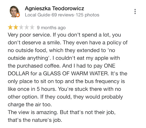 Ā Ā Ā Read moreVery poor customer service! Weāve been there after the long hiking from Waterfall gully, super thirsty and hungry. As our husbands and kids were going to join us, we booked a table while waiting for them. Weāve been told that we canāt wait there and eat nothing for 20 minutes. Then one of us decided to order a juice. My husband and my kid came in less than 15 minutes while we were waiting for the rest. I Offered my kid some dried sultanas that brought from home and asked others if they want to have some while waiting. Then a lady from the cafe came to us with a very rude manners and attitude warned us that we can not eat our food! I wouldnāt feed my 20 months baby with my restaurant food! I asked to see the manager to discuss the issue with him. Unfortunately, his behaviour was really bad too. While I assured him that weāre there to have our breakfast and definitely will spent some money there, he tried hard to not apologies for his and his staff memberās poor attitude. Really not recommend this place. Not a place to relax and enjoy your day. As you have to just concentrate on spending money before being kicked out the place! And yes we ordered food for 6 people eventually -as planned- as there is no other place to eat on the summit!