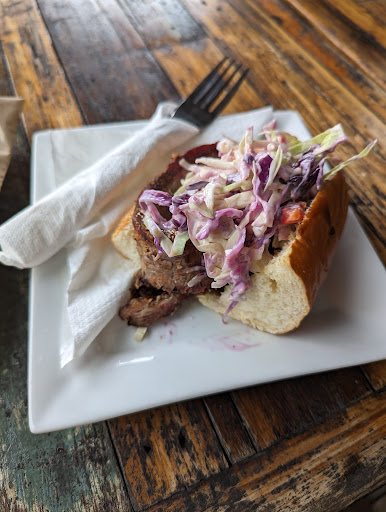 We were served by a lady at the counter who says in an annoyed tone (and I quote): "we ain't got no more beef for your smoked beef burger, we got lamb or pork". Ok. Maybe don't advertise a smoked beef burger on the menu next time. Opted for the lamb. My friend gets the smoked pork roll.