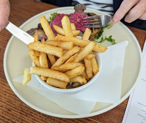 Both the lamb and duck were well seasoned and nicely rare inside. The salads on which they lay were fresh. The steak was likewise cooked well and sitting on a piece of sourdough and caramelised onions. A small basket of not quite crunchy fries accompanied.
