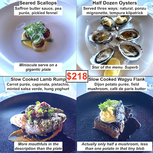 Read moreWhen you pay $109 per head for the food and ferry portion of the visit, you shouldn't have to walk away still hungry. For the money you pay, the serves are too small, especially the pathetic tiny squib of potato with the wagyu flank. The meat was lovely, the sauce beautiful, but you were too tight to give a decent serve of potato to help soak up the sauce or even serve a single mushroom when the description states "...Dijon potato purée, field mushroom...". It is important that you don't send customers home hungry or expect them to pay for extras when it is already at a premium price. 50c worth of potato and a whole mushroom would not destroy your profit margin at these prices. On the positive side, the food was beautiful. 5/5 for flavour and taste - 2/5 for quantity (except the oysters - menu said half dozen and half dozen came). I've deducted a star as well for the "guided buggy tour" which we paid an extra $60 ($30pp) for. Not only was the buggy so sluggish we got left behind, but more disappointing was the "guided tour" which was nothing more than ONE stop around the rushed trip around the golf course and a description of the course. No information about the history of the place or the vegetation or the fauna. Very disappointing. But let me finish with a mention of the staff. Everyone we delt with were very professional and friendly. I'll blame management and not the staff member for the disappointing...