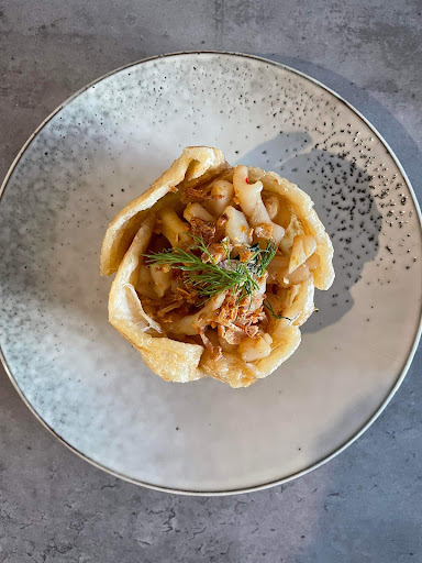 For mains: Dancing Chilli Squid - W sweet caramelised red chill basil squids in a Roti Cup.