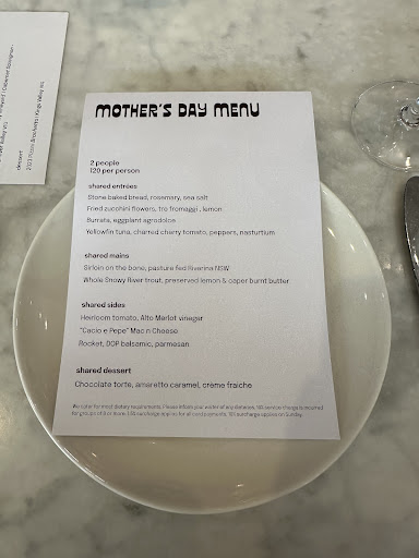After the first courses came out without the burrata, I asked where the burrata was and that if it meant that the entire experience had to be one or the other, we would prefer dairy as it was my Mother’s Day lunch and I am not lactose intolerant.The waiter was great and sorted the burrata, however, everything else had no dairy. The fish, steak and dessert were all missing the dairy accompaniments or were cooked differently and we were not offered the Mac and cheese despite it being on the set menu. I sat there watching everyone else have a delicious, buttery, saucy experience and felt I missed out. The people on the table next to us did let me know the Mac and cheese was fabulous.