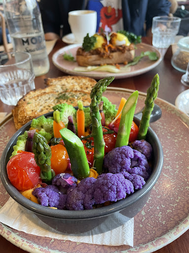 Read moreA while ago I saw someone post the photos from East Row and I was attracted, finally I got the chance to go to Canberra to get a closer look of Van Gogh, I know it is the right time to try East Row. The first impression is great, since the building is so different, and it is called Sydney building. So interesting. The café is giant and there are so many people there having brunch, which means it must be good. They serve good quality sparking water for free, but I have to say the coffee is not cheap($5 for medium). They have a separate menu for coffee, for milk based coffee you can choose from two different beans. Since I am trying to get rid of caffeine, I ordered decaf(I know it is weird to drink coffee without caffeine)so no chance to choose beans, but I have to say even the decaf taste so nice.(Is it only because I am on holiday and in good mood?) My hubby chose the milk based Hitman, he enjoyed it. For breakfast you have nine choices from the menu, two sweet ones (Açaà bow and French Toast) and all the others are savory, we have the Veggie Pot and the Pork Benedict. I love the presentation of the Veggie Pot, it is so cute. The two different of carrots and the asparagus are standing there in the pot. And it is the first time for me to eat purple cauliflower (though the taste is the same with normal one). I love the sweet potato hummus, it adds so much flavour to the pot, since the veggies are just cold and plain, I have to say.It would be better if the veggie can be served warm I think. My hubby finished his benedict really quickly, I just got a small bite of it, it is not bad. The is a great place for a coffee or brunch, the staff are really attentive and friendly. Also I can see the excitement from the people around me when they were waiting for their meals to come, which is really interesting to notice.But maybe next time when I come to Canberra I will try a new café to have a...