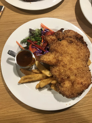 We sat and waited and waited until one of us got up to get a menu. No one check up on us or cleaned plates or anything. Most of our food was extremely disappointing. Schnitzels being dry like cardboard and my âAngus 200g Beef Patty & Baconâ being a frozen patty that was still cold in the centre. Did I mention the kitchen staff were not close to being busy to justify the menu.