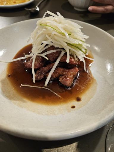 Unfortunately, the service times were off, likely due to it being only their second week. We were seated at 6 pm and ordered by 6:10 pm, but our first dish didn’t arrive until 6:45 pm. This delay resulted in a rushed end to our two-hour booking, with several dishes, including the beef, pork, and dessert, served at 7:40 pm. We were asked to hurry up as the next booking was at 8 pm. We opted to take away the dishes we couldn’t finish, but they came wrapped in foil as there were no takeaway containers available.