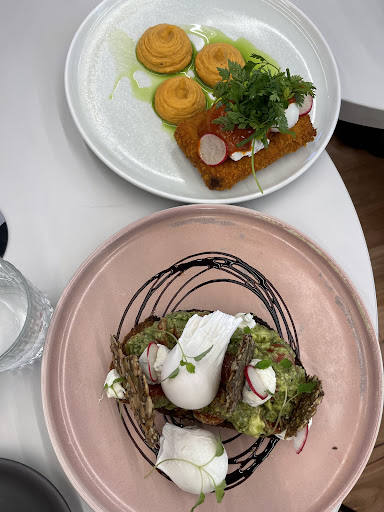 The wait staff were nice enough, but very unaccommodating when it came to the menu. They have distinct lunch & breakfast menus, which is fine, but the breakfast menu does make it clear they can do eggs all the standard ways. This is important because they refused to change out the poached eggs on the Pesto, Eggs & Fetta on Toast dish. As runny yolks are a risk for pregnant women, we asked if we could have scrambled or fried eggs instead, but they said they couldn't do any changes. The best they could offer was to cook the poached egg until the yolks were hard. But who wants a hardboiled poached egg??? She ordered the crab & prawn linguine instead because all the dishes with eggs on the lunch menu were poached eggs only.