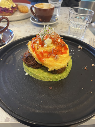 I have to get the rainbow fritters every time, which are a symphony of colour, flavour and texture! You’ve got a bed of creamy, lightly salted smashed avocado. The 3 fritters come steaming hot, with a crisp outside and juicy inside. It’s fresh and warming at the same time! The egg on top is a firmer scramble, and is so silky; I really love this style! Finally the garnish of crispy onions, siracha and goats cheese adds a vibrant burst of flavours to tie everything together. I cannot stop raving about this dish!