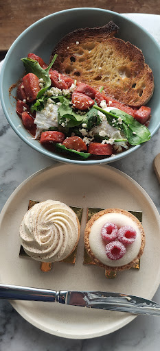 Came here for a little cake and hot chocolate for my sister’s 21st, and was promptly disappointed. Parking is extremely difficult, which is not at the fault of the store but something to be aware of when visiting. I’ve never visited a place where every person working seemed to hate their job in such a way! I understand that when its raining and getting to the end of the week, sometimes the atmosphere takes a hit, however we were treated as a burden for simply ordering our food and drinks which was a bit shocking! We ordered the lemon lime cheesecake, the chocolate mud cake and the mille feuille, alongside three hot chocolates. The cakes were tasty, if not a little dry from sitting out in the fridge. It was a shame that we didn’t receive our hot chocolates until we had already finished eating, and the horrid noise of the buzzers going off was definitely another vibe killer. When we received the hot chocolates, they were scalding, bitter and watery. For the amount of time they took to make, they were severely lacking. We then went next door to the cake shop, on the direction of the very sour server at the front counter of the patisserie, where we waited, crammed in a tiny counter space, for someone to serve us. Despite ringing the bell when we came in, it took minutes for someone to leisurely make their way to the front of the store and not even say hello, she just pointedly stared at us. When we made it clear we were picking a cake up, that we had ordered days im advance, they brought it to the front only for it to have a major spelling mistake on it. Given the treatment we’d received so far, we didn’t even bother complaining there, as we didn’t feel we’d be taken seriously in the slightest, however I feel if you write on cakes everyday, and charge $5 extra on top of a $40 price tag (for a cake that was much smaller than expected), you would know to write 21st, not 21th, on the top of the cake. Honestly it was almost comical after the experience we had, so luckily we are able to laugh it off and wish my poor sister a happy 21th birthday, but a warning to anybody else looking to visit here to think twice, and perhaps look elsewhere for your birthday...