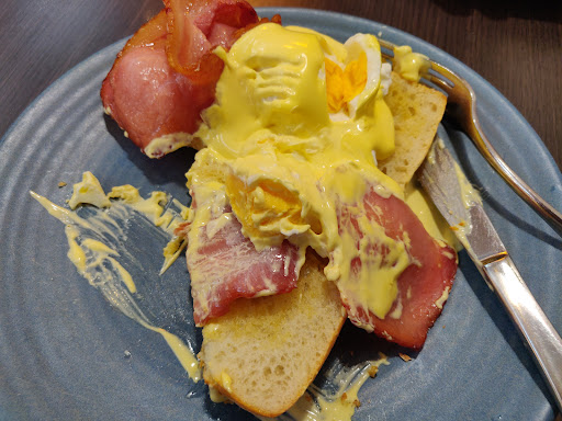 We ordered an Eggs Benedict with spinach and halloumi and added mushrooms. Basically no spinach on the plate, there was approximately 3 button mushrooms quartered, the poached egg was well over cooked and the halloumi was dry and barely even cooked (like a candle had waved over it).