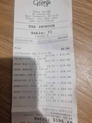Read moreWe cannot express our dissatisfaction and disappointment in this restaurant. If we could give a 0 we would. It was not overly crowded. We were celebrating a birthday in the family. It took over 1/2 hour to get a waitress to take our order from a very limited menu. We asked for sparkling water and bread. The water failed to appear and we had to ask for the bread more than once. The meal took 90 minutes to arrive. Others in the restaurant were served before us even though they had arrived well after us. The waitresses looked bored and was not particularly interested in serving us. Shame on management for such pathetic service. The meal came at different intervals for each of us. The cos lettuce was gritty with dirt We had organised for a birthday dessert but decided to leave as the entire experience was completely disappointing and we will not be returning. Our host was so angry he left the restaurant as soon as he paid and he had not checked his bill- we discovered on arriving home that we were charged $16 for the sparkling water that failed to arrive. I called Sue, the owner of the restaurant , to discuss our very poor experience and also asked that she phone our host in order that the $16 be paid back to him. Not a word form her. Shameful. What a waste of hard earned money. Go to Little Creatures instead.