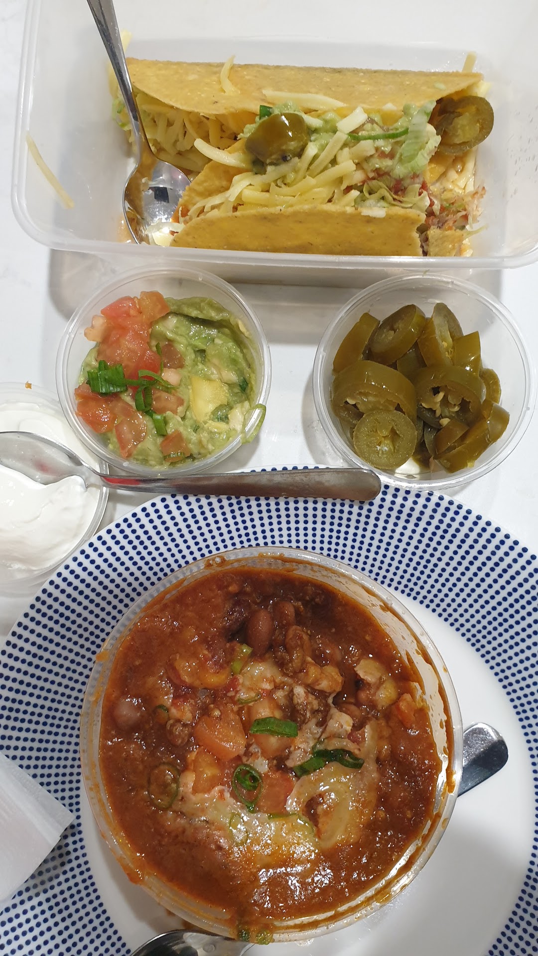Amazing food and very fast service. We ordered two Chilli Con Carne Tacos (Hot because why get Mexican if you’re going to choose the Mild or Moderate option), one Beef Taco, one Chicken Taco, a Beef Enchilada, Jalapeño Poppers, Hot Chips and two sides of Guacamole.