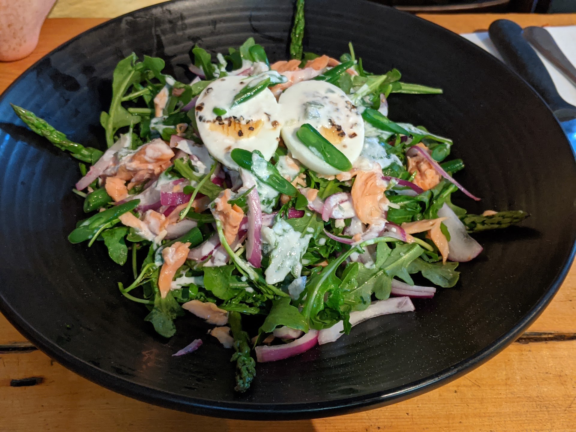 Lunch on Sunday 28th May. Pub has ambiance but no atmosphere. Tables sticky, need heavy duty cleaning. Bar staff friendly but when making menu enquiries to another floor staff member re rocket salad, was condecendingly advised calamari was listed with rocket salad. I politely asked if there was any other salad options for the chicken parmi as it was also only served with rocket and there was no other side salad options on the menu. We compromised that the rocket could be substituted with cos lettuce. I ordered the Gamberi prawn pizza. It was fairly tasteless, thin crust in the middle but outside crusts crisp on the outside but very doughy on the inside. Ordered the pizza after reading rave reviews online stating best pizza ever but definitely not in my opinion and I have sampled pizzas worldwide. Fellow diner's parmi was fine, few chips only and cos lettuce was wilted. Pepper sauce on the side was served in very small ramekin and not worth the extra charge. Meals and drinks are expensive especially for a regional pub, $21.50 for a scooner of beer and regular sized house wine. With the cost of living so high it is no wonder people are avoiding eating out at these overpriced venues when there is no value for money. It's a no brainer that pubs must start to encourage diners back by offering tasty meals and drinks at a more affordable price. Newsflash, not everyone loves rocket so at least offer a tasty salad alternative. Not that hard. Very disappointing...