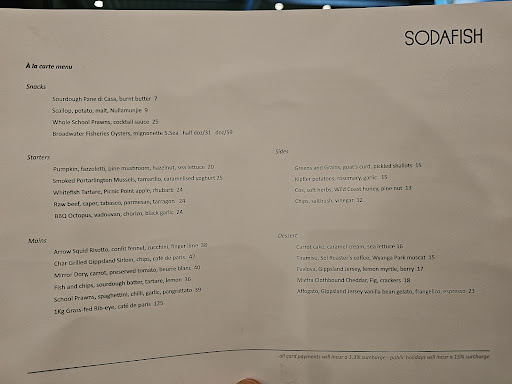 The biggest disappointment was the fish and chips! The chips had the texture of cardboard and weren't salted well. The batter on the fish was thick and flavourless. I'm not beyond paying $32 for fish and chips - but only if it's better than the takeaway across the road!